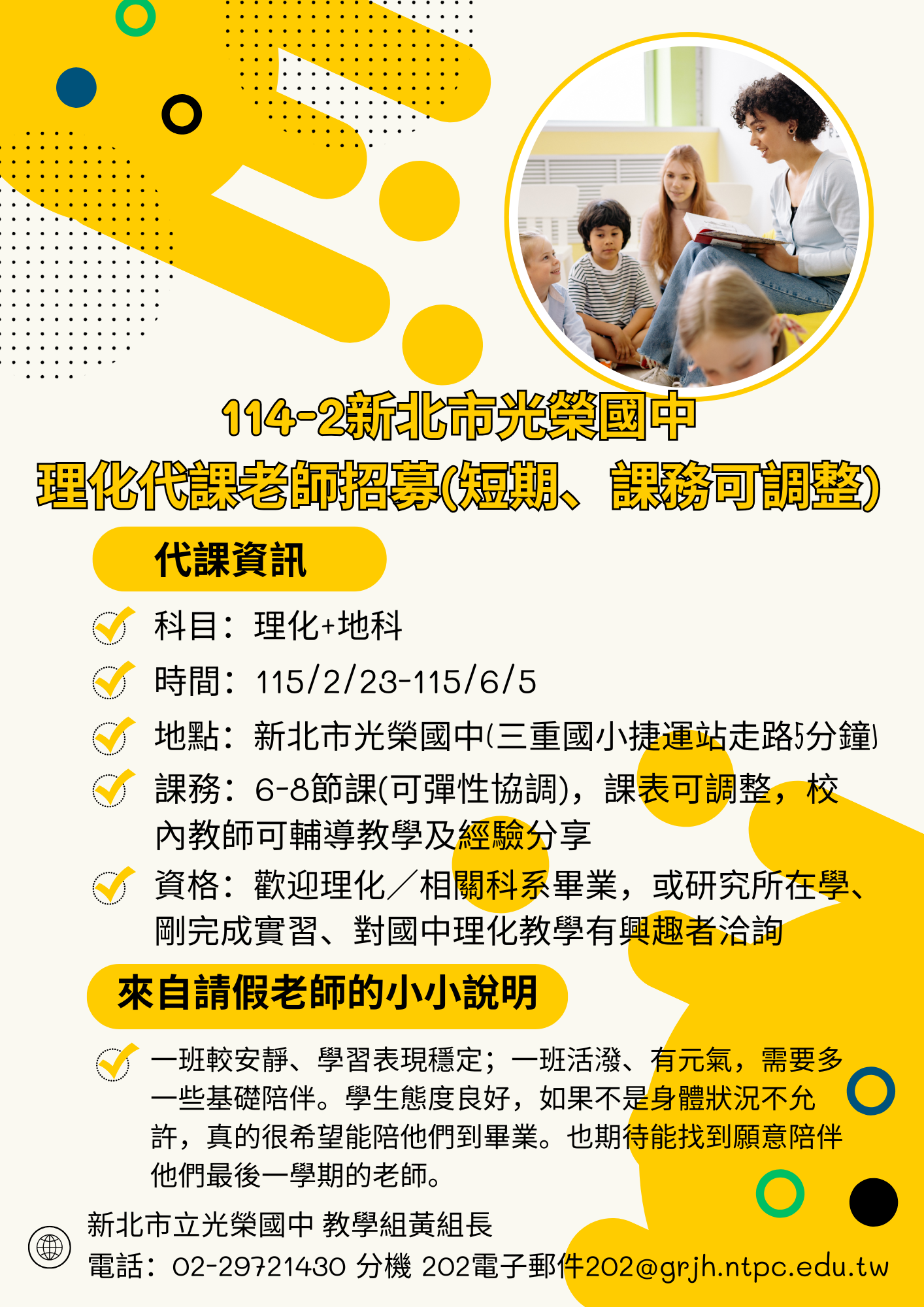 【114-2光榮國中誠徵理化代課教師(短代、課務可調整)】
