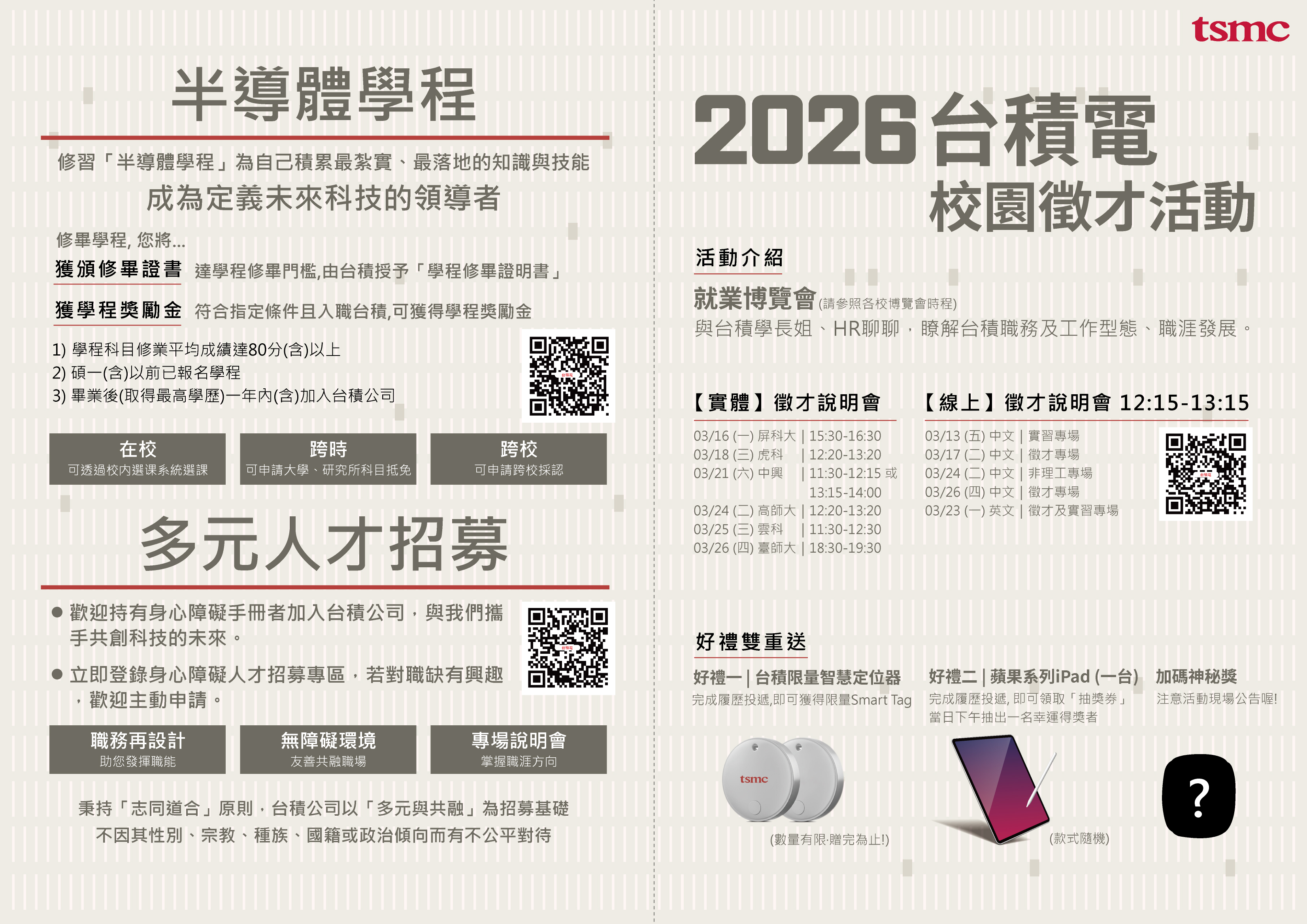 Career Fair: We welcome you to visit our on-site booths to interact face-to-face with TSMC seniors and HR representatives! Gain in-depth insights into the job responsibilities, work styles, practical applications, and career development paths for various majors at TSMC. Submit your resume on-site for a chance to win prizes like an Apple iPad (model selected at random)!