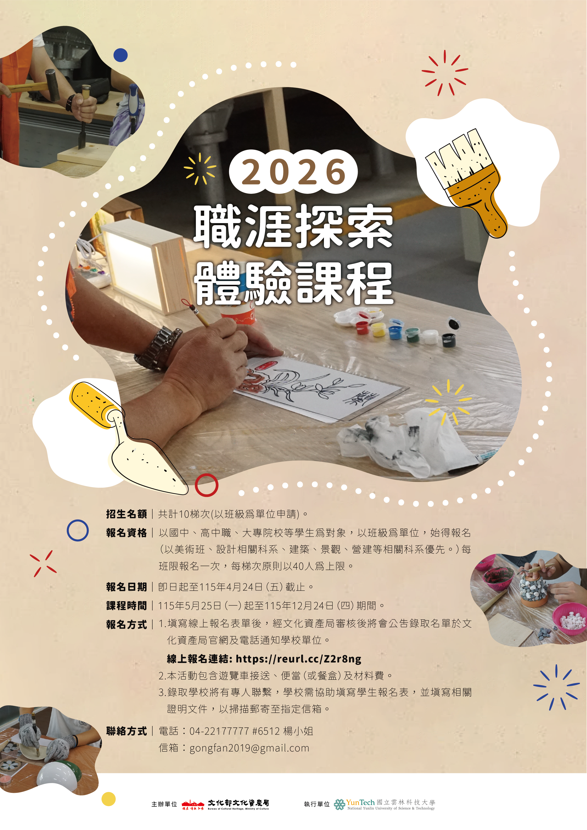 一、有關文化部文化資產局(下稱該局)辦理文資傳匠工坊「2026職涯探索體驗課程」相關資訊,並協助轉知所屬並鼓勵踴躍報名參加。