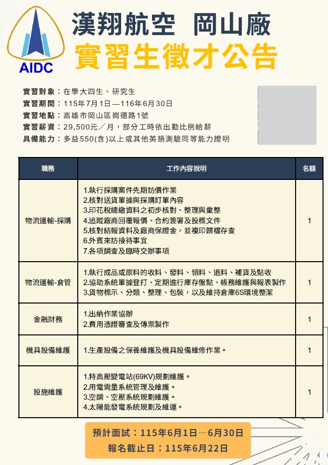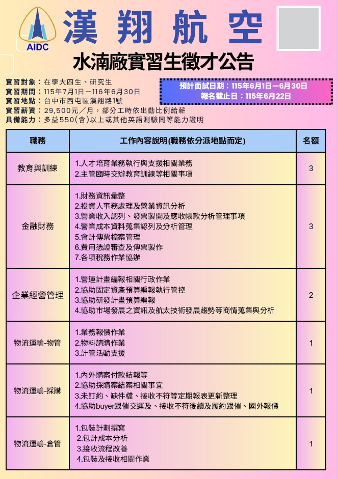 漢翔航空(AIDC)招募115學年度(2026年7月至2027年6月)一年期實習生,主要針對升大四或研究生,工作地點涵蓋台中與高雄,實習期間基本工資約$28,590,招募理工、財會、資管、人資、物料等專業,申請截止至115年6月22日,歡迎應屆畢業生應徵。