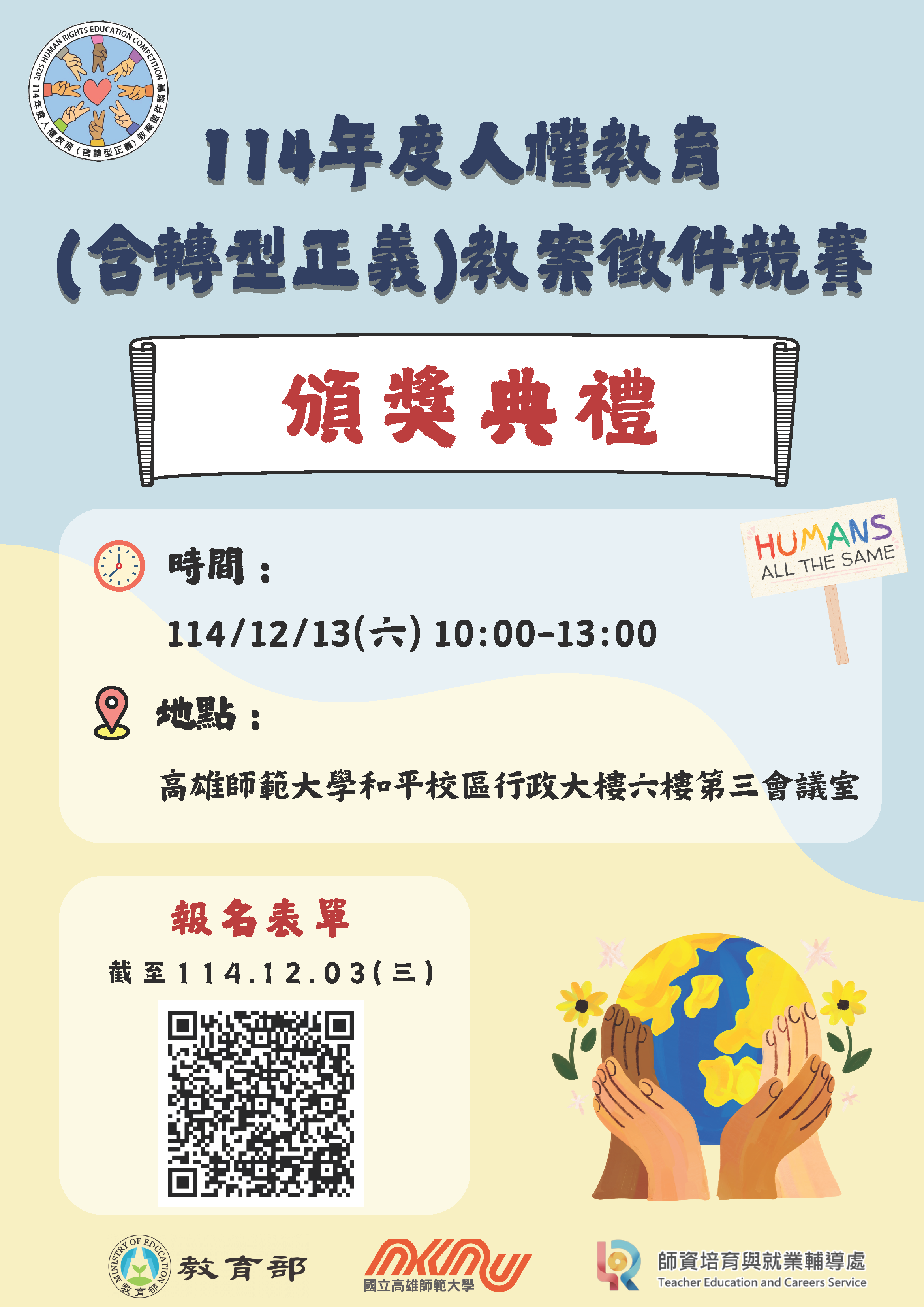 我們將於 114年12月13日(六) 辦理「114年度人權教育(含轉型正義)教案徵件競賽頒獎典禮」,誠摯邀請師資生參與本次觀禮活動,共同見證教案得獎者的榮耀時刻。