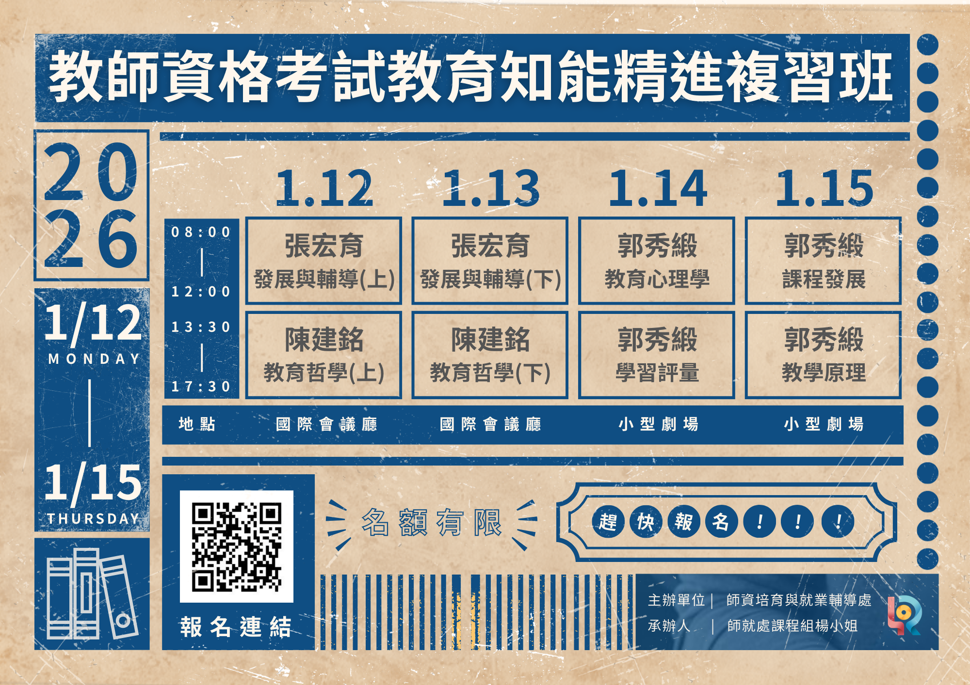明年(115年)六月要參加教師資格考試的校內師資生(師培生與學程生),114學年度第一學期只辦理一場教師資格考試複習班。